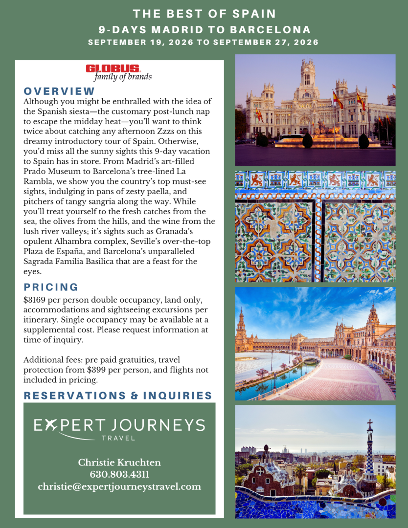 Get ready for a once-in-a-lifetime adventure! Expert Journeys Travel has secured exclusive group space for a spectacular tour through one of Europe’s most vibrant and captivating countries—Spain.